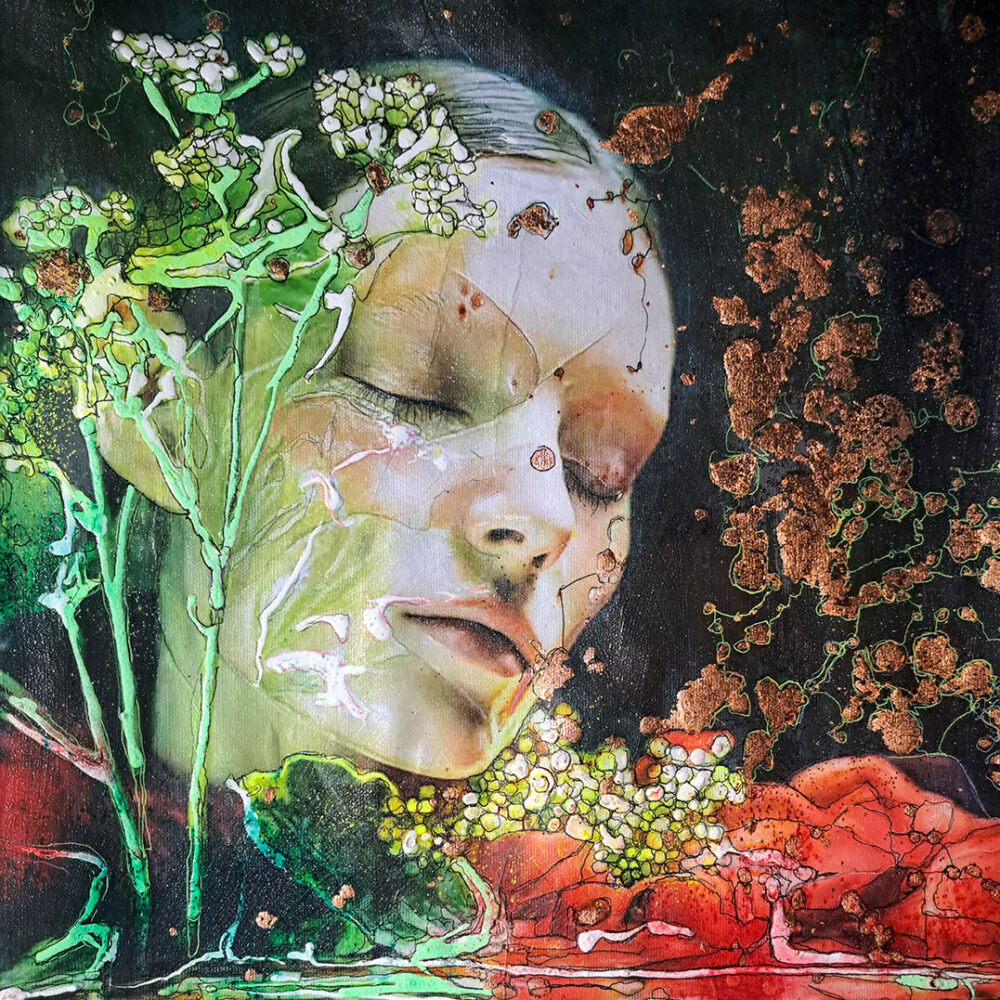 Ich habe Floral Reverie gemalt, um einen stillen Moment darzustellen, in dem das Gesicht einer Frau und zarte grün-weiße Blüten miteinander verflechten. Sanfte, gedämpfte Hauttöne kontrastieren kupfer- und rote Akzente für Textur und Kontrast; Ich habe die Oberfläche mit geschichteten Glasuren und feiner Linienführung aufgebaut, sodass sich Teile in die floralen Elemente auflösen.