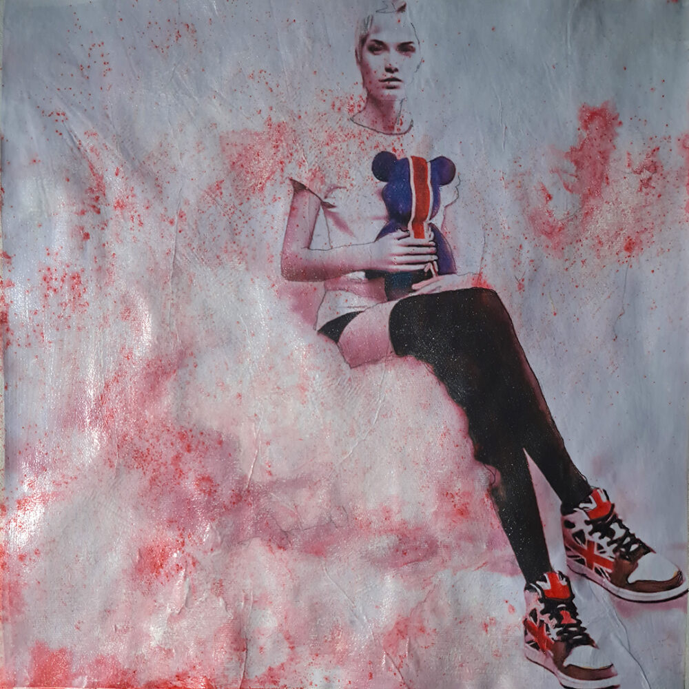 Ich nenne diesen hier "Teddy Threads". Ich wollte die modische Attitüde mit einem Hauch kindlicher Sanftheit kontrastieren – das Porträt zeigt eine gelassene Figur, die einen stilisierten Teddy sitzend auf Wolken hält. Die hohen Socken und die markanten Sneaker verleihen eine unerwartete Note. Welches Element fesselt dich zuerst: der Bär, die Schuhe oder die Wolken?